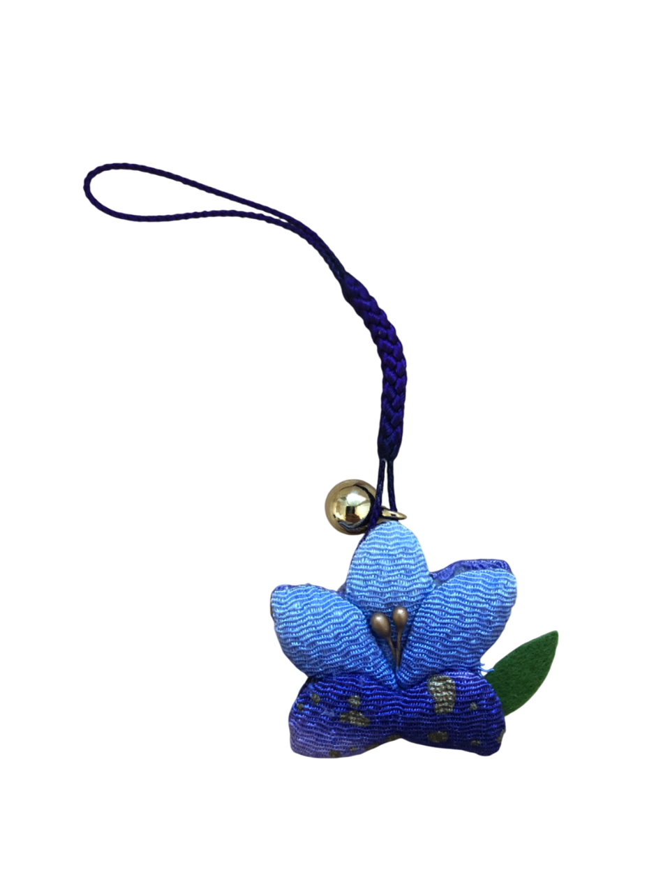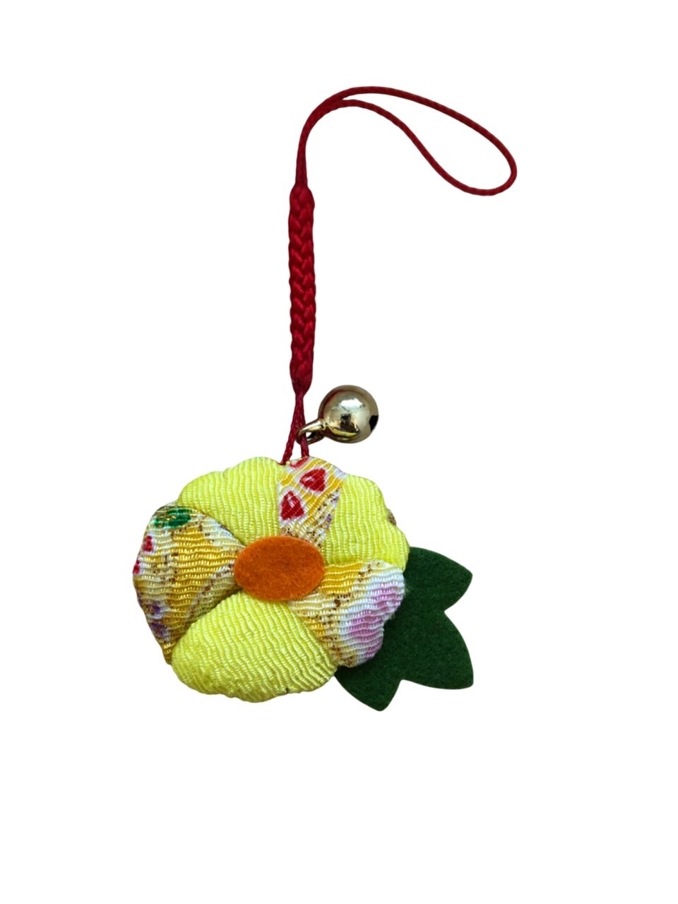 ちりめん生地で作られた、優美な花の根付です。日本の伝統美を感じられるこの根付は、鍵や鞄に付けるのにぴったりで、日常から特別な日まで幅広くお使いいただけます。