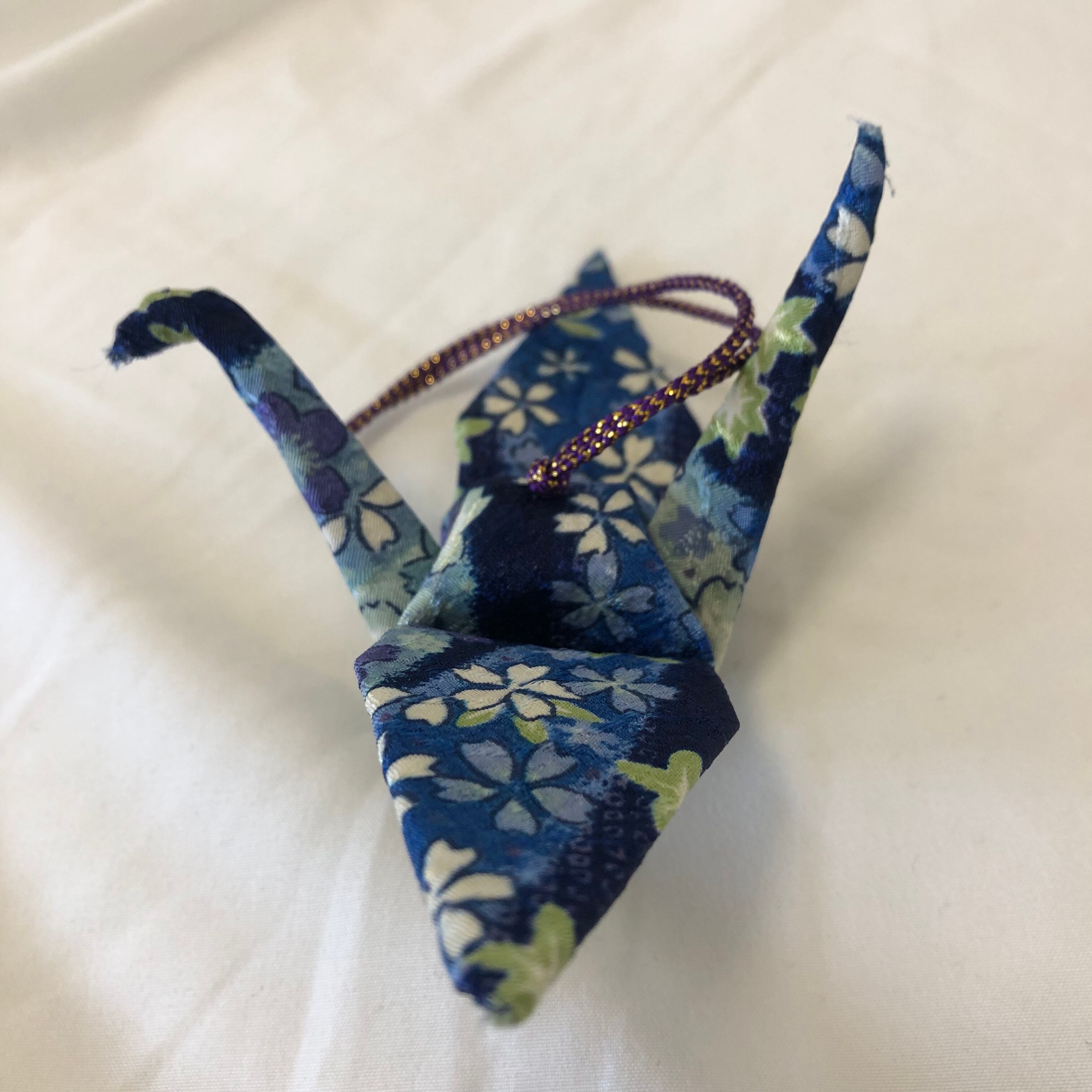 高級着物の布で包まれた折鶴。